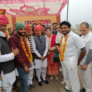 इसके पहले आयोजन समिति द्वारा सभी आगंतुक अतिथियों का पुष्पहार वा साफा पहनाकर स्वागत किया गया।