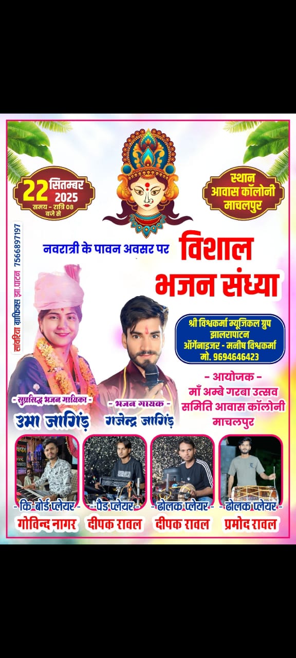 माचलपुर:- नगर के आवास कालोनी मैं नवरात्रि के पावन अवसर पर आज दिनांक 22 सितम्बर 2025 को एक विशाल भजन संध्या के माध्यम से सुप्रसिद्ध भजन गायक उमा जांगिड, एवं गजेन्द्र जांगिड़ अपने भजनों के माध्यम से माता रानी के दरबार मे अपनी विशेष हाजरी प्रस्तुति देकर माता के भजनों का गायन करेंगे, माँ अम्बे गरबा उत्सव समिति आवास कालोनी द्वारा उक्त विशाल भजन संध्या का आयोजन किया गया है। जिसमें श्री विश्ववकर्मा म्यूजिक गृप झालरापाटन के अनेक ग्रुप सदस्य अपनी प्रस्तुति देंगे।