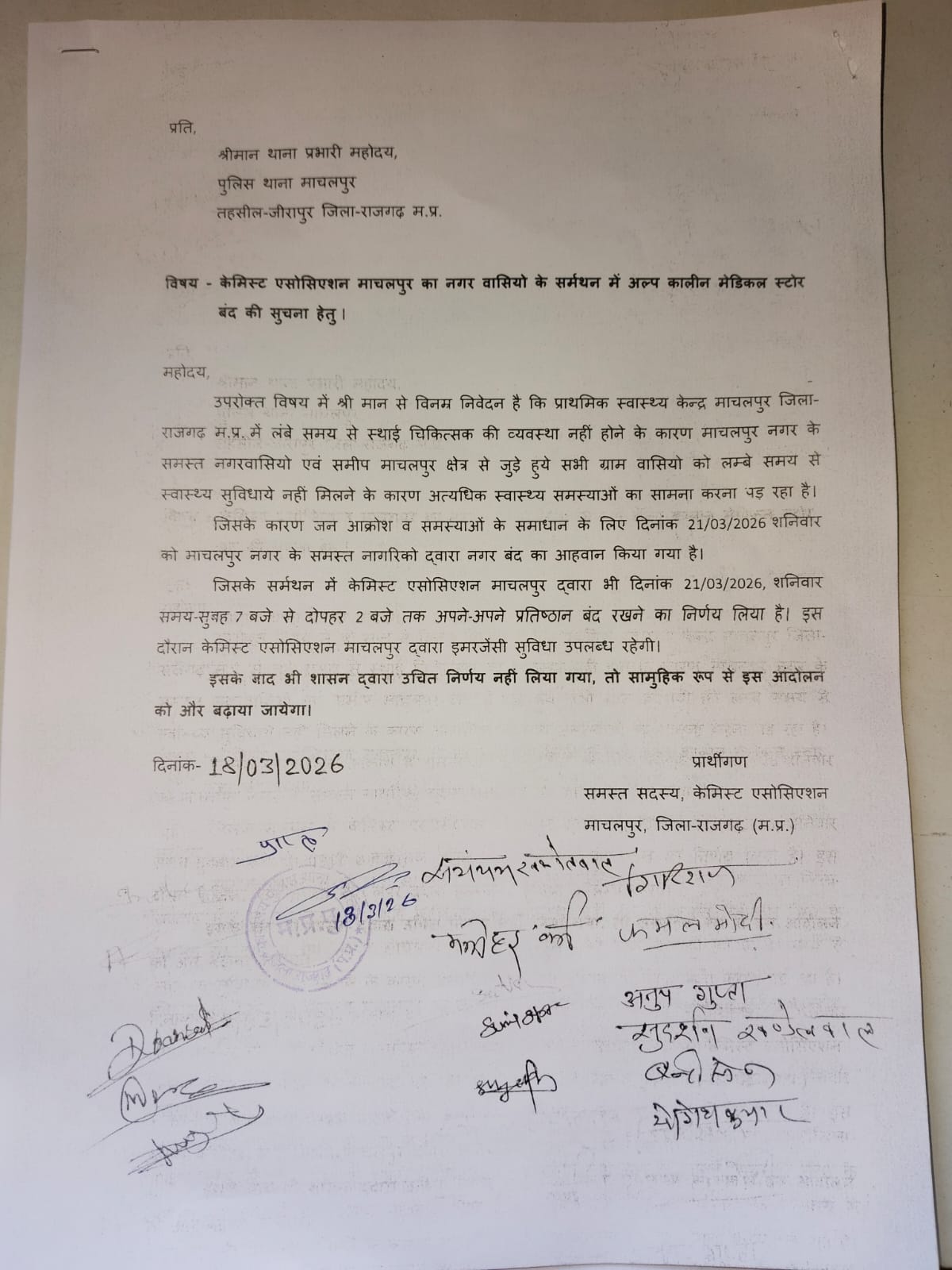 👉 इसी कड़ी में केमिस्ट एसोसिएशन माचलपुर ने भी नगरवासियों के समर्थन में अपने मेडिकल स्टोर बंद रखने का निर्णय लिया है।