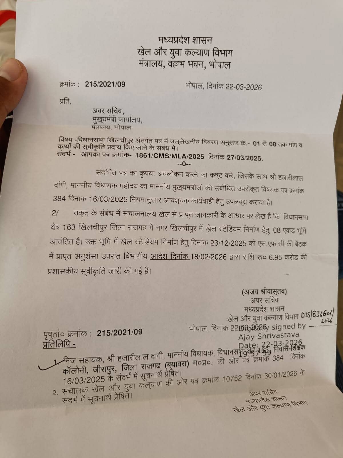 рдЦрд┐рд▓рдЪреАрдкреБрд░ ( рдЖрдХрд╛рд╢ рд╢рд░реНрдорд╛ ) рд░рд╛рдЬрдЧрдврд╝ рдЬрд┐рд▓реЗ рдХреЗ рдЦрд┐рд▓рдЪреАрдкреБрд░ рдирдЧрд░ рдХреЗ рд▓рд┐рдП рдПрдХ рдРрддрд┐рд╣рд╛рд╕рд┐рдХ рдФрд░ рдмрд╣реБрдкреНрд░рддреАрдХреНрд╖рд┐рдд рд╕реМрдЧрд╛рдд рд╕рд╛рдордиреЗ рдЖрдИ рд╣реИред рдЦреЗрд▓ рдкреНрд░реЗрдорд┐рдпреЛрдВ рдФрд░ рдпреБрд╡рд╛рдУрдВ рдХреЗ рд╕рдкрдиреЛрдВ рдХреЛ рдкрдВрдЦ рджреЗрддреЗ рд╣реБрдП, рдпрд╣рд╛рдВ рдЕрддреНрдпрд╛рдзреБрдирд┐рдХ рдЦреЗрд▓ рд╕реНрдЯреЗрдбрд┐рдпрдо рдирд┐рд░реНрдорд╛рдг рдХреЗ рд▓рд┐рдП тВ╣6 рдХрд░реЛрдбрд╝ 95 рд▓рд╛рдЦ рдХреА рдмрдбрд╝реА рд░рд╛рд╢рд┐ рдХреЛ рдордВрдЬреВрд░реА рдорд┐рд▓ рдЧрдИ рд╣реИред