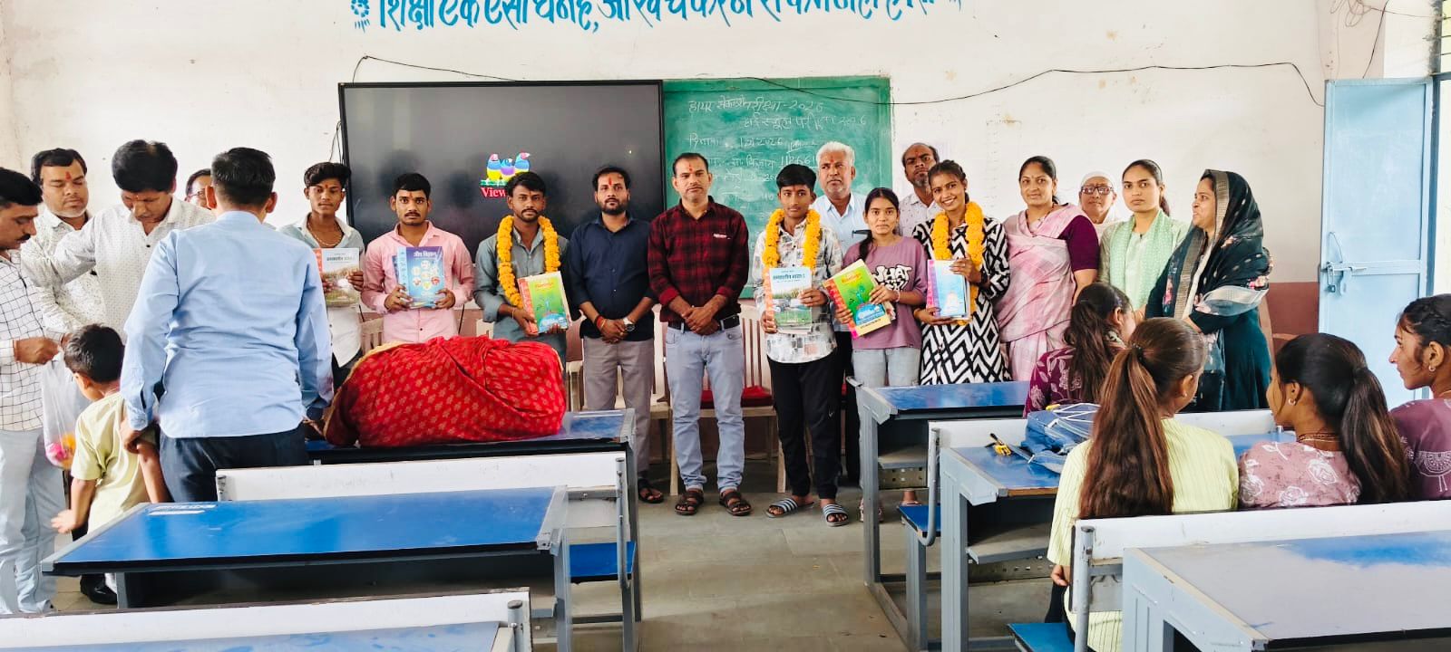 कार्यक्रम के अंत में सभी शिक्षकों ने विद्यार्थियों का तिलक लगाकर स्वागत किया और उन्हें मिठाई खिलाकर पुस्तके वितरण कर शैक्षणिक सत्र की शुभकामनाएँ दीं।