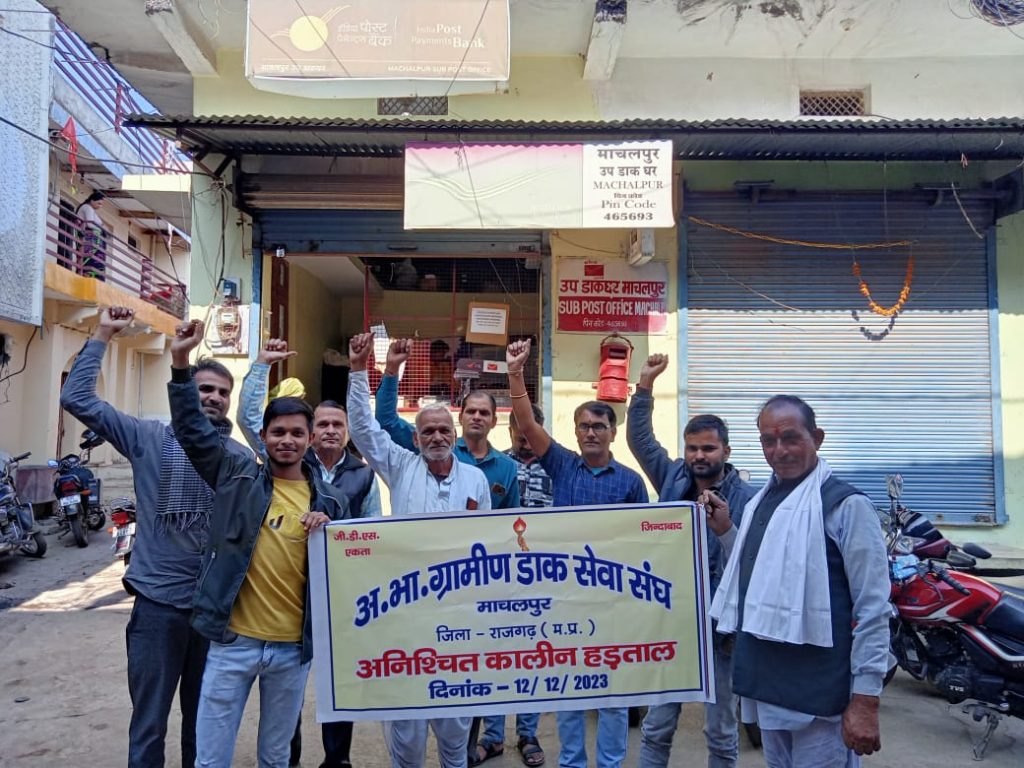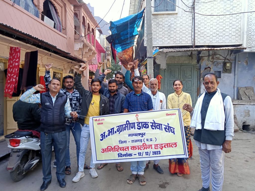 अपनी मांगों को लेकर हाथ मे बेनर लिए हड़ताल कर रहें यूनियन के फूलसिंह, हरिसिंह दांगी,महेश व्यास, रामविलास गुप्ता, चंदरसिंह, सुरेश दांगी, केवल सिंह, ओमप्रकाश दांगी, हरिओम गुजराती, पूजा दांगी सहित ग्रामीण डाक सेवक शामिल रहे।